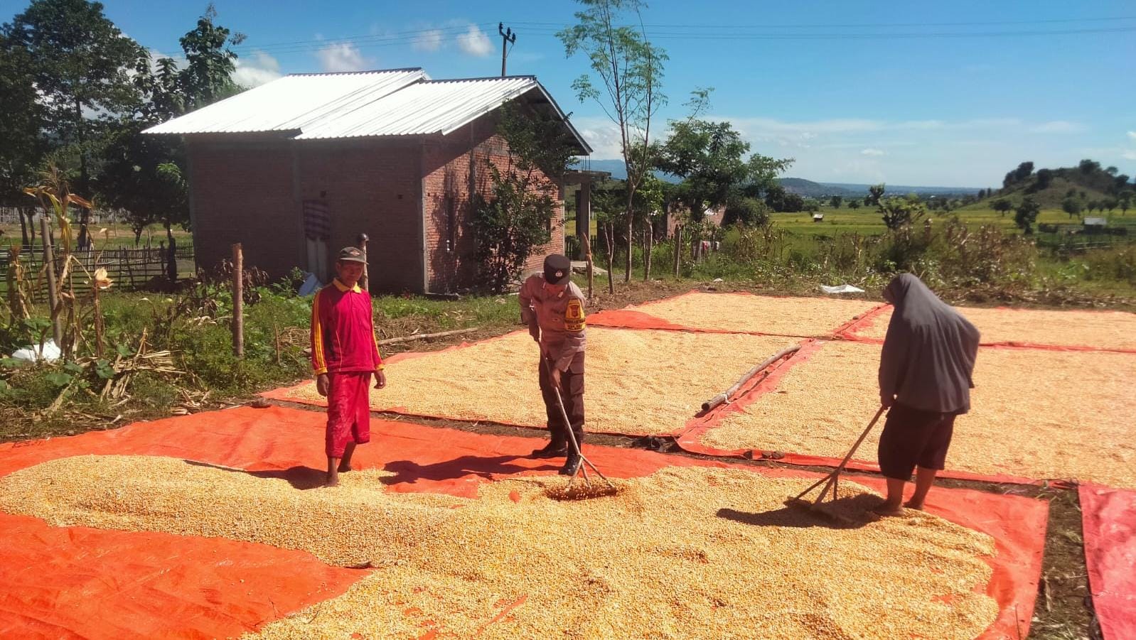 Bripka I Wayan Parwata merupakan ikut serta berkegiatan dalam pengeringan hasil panen jagung milik warga binaan di Desa Risa Kecamatan Woha Kabupaten Binaannya, Jum,at 11 Maret 2025 Pukul 09.45 WITA.