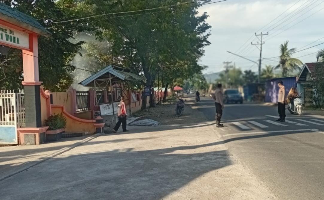Terlihat anggota Polsek Woha membantu menyeberangkan anak sekolah  serta anggota lainnya mengatur arus Lalulintas dan membantu menyeberangkan pelajar yang hendak ke Sekolah.